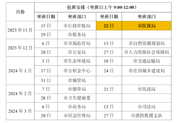 市民朋友可以根据下表的安排,与部门负责人面对面交流,提出改进政务服务的意见建议。